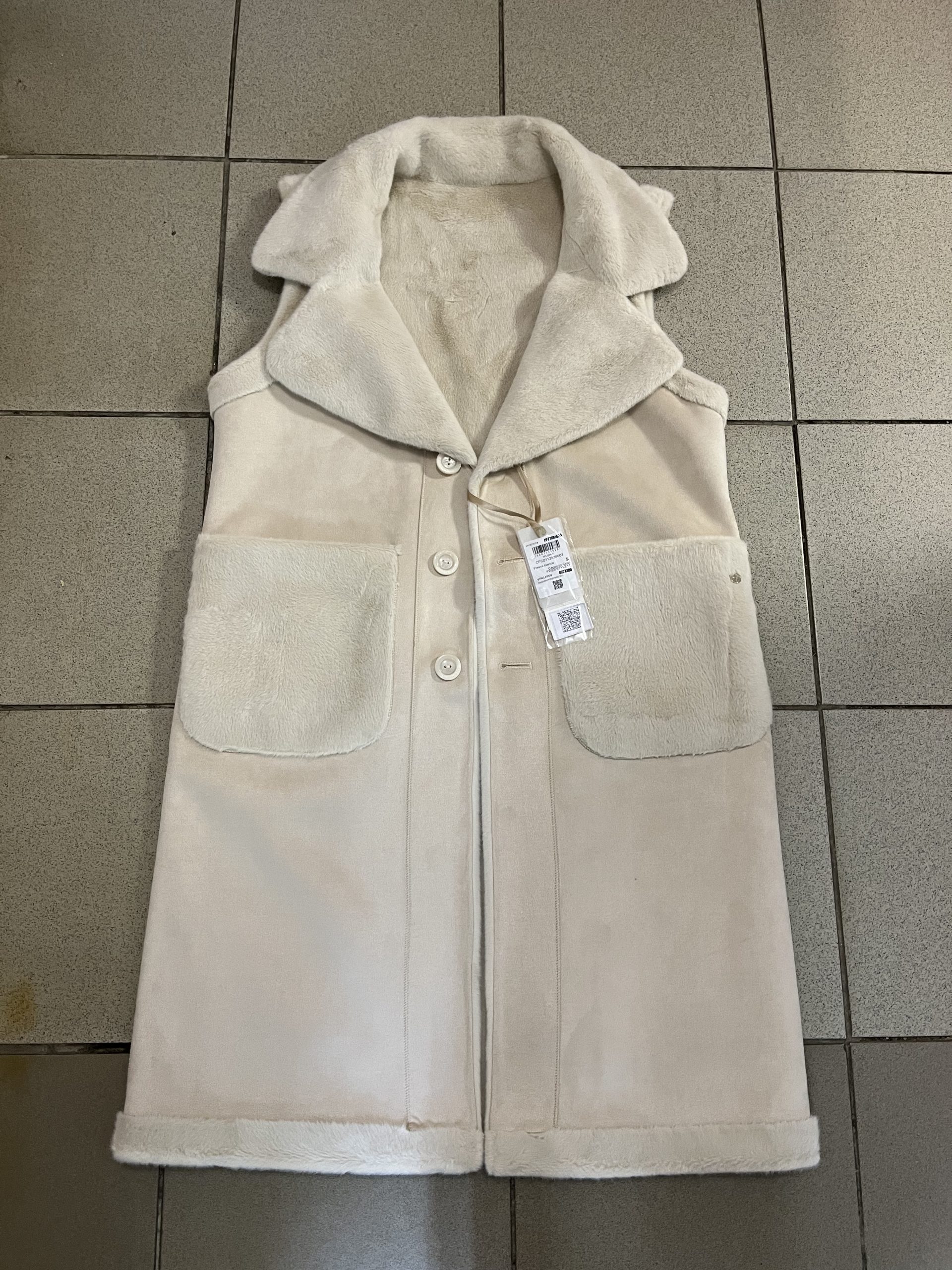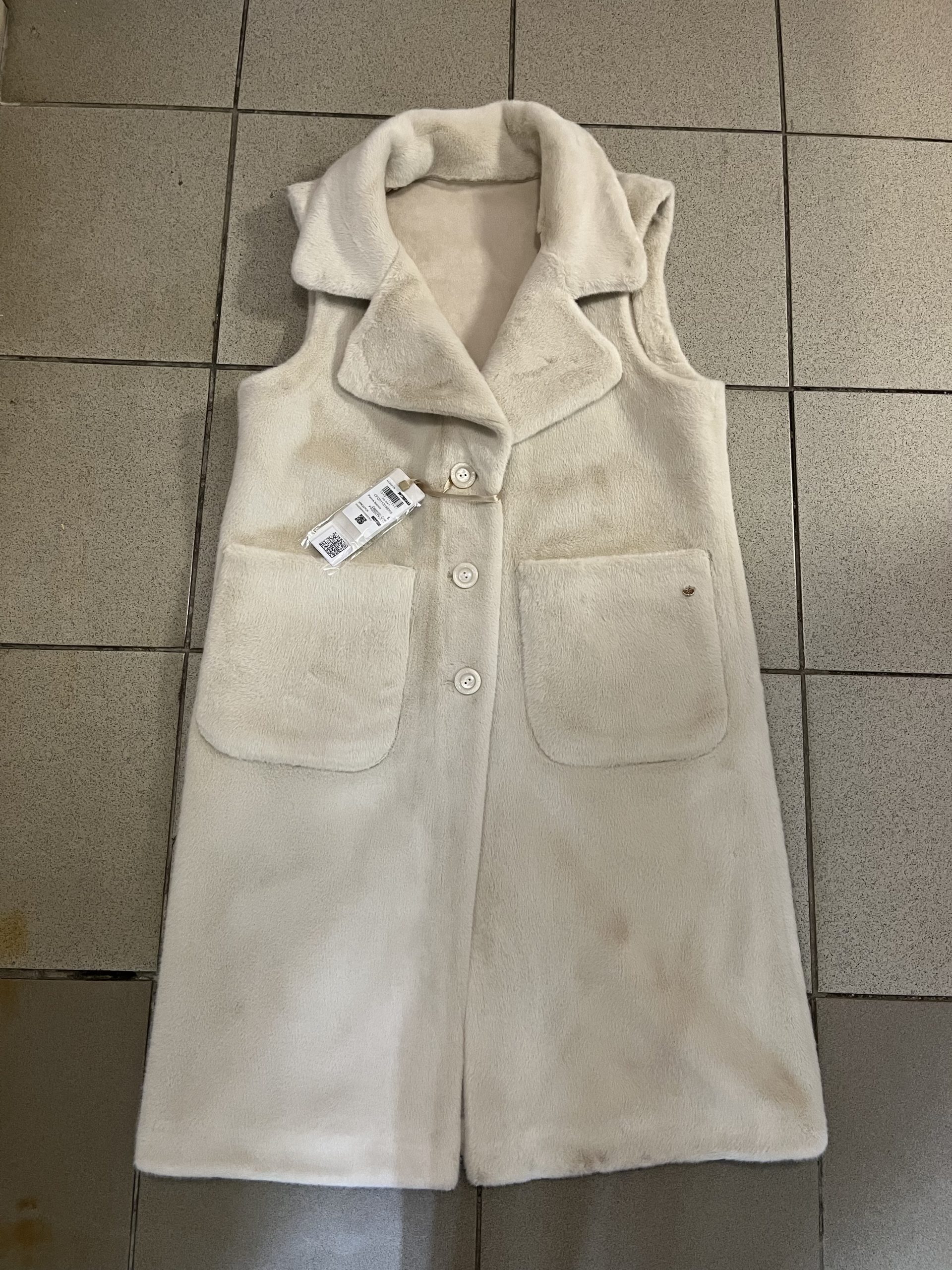 Женское пальто без рукавов нежного кремового цвета прямого силуэта от эксклюзивного итальянского бренда Rinascimento.