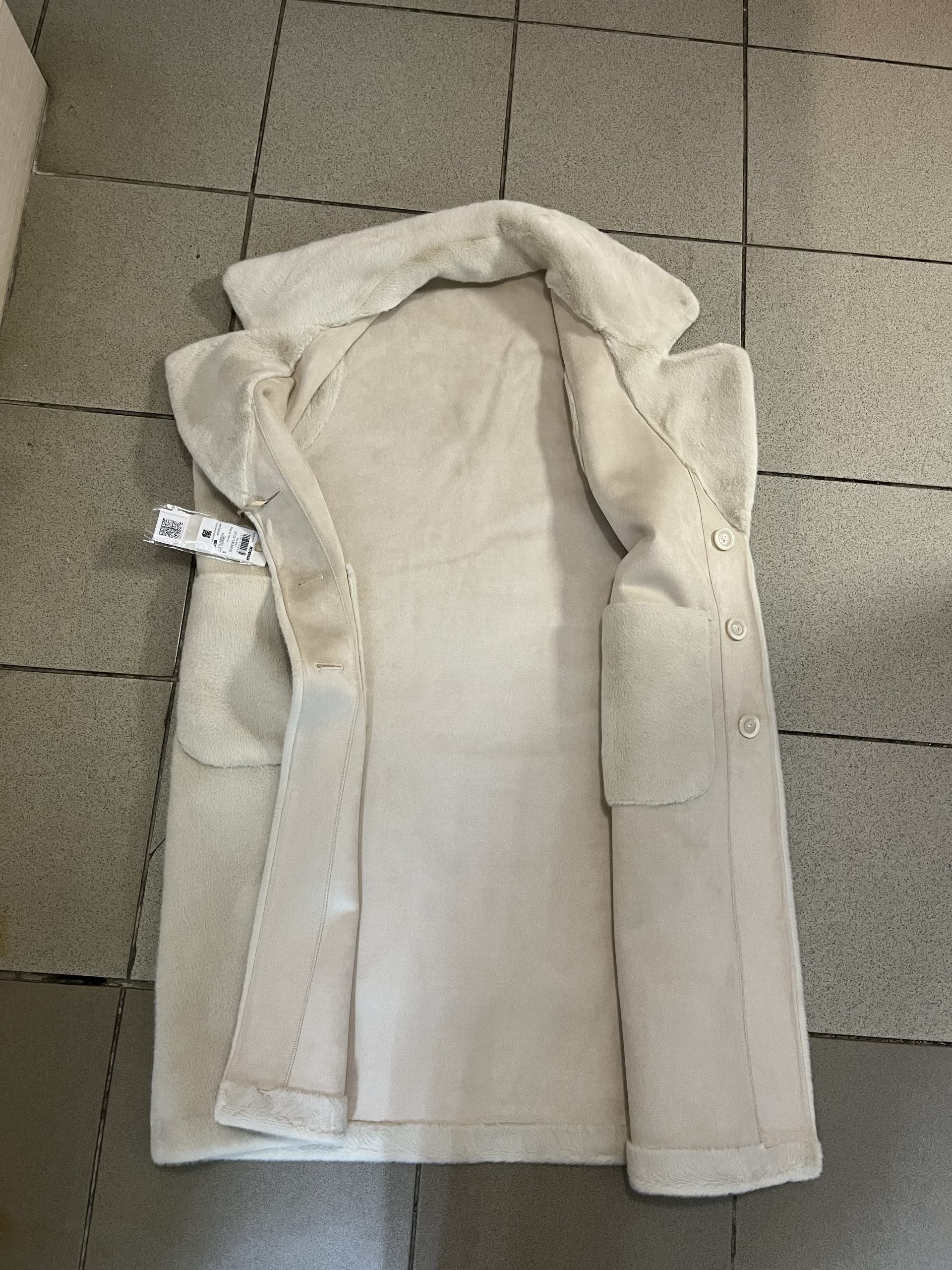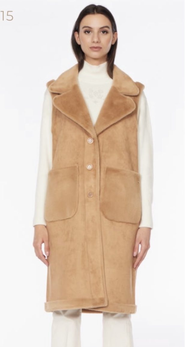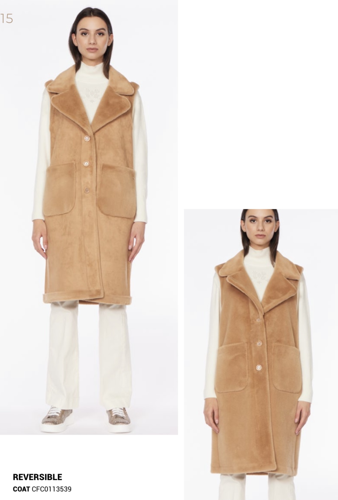 Элегантная двусторонняя модель: 1 сторона — гладкая ткань с меховыми карманами и воротником, 2 сторона — полностью меховая ткань.